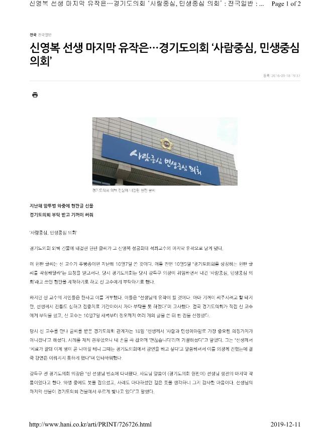 지난해 암투병 와중에 현판글 선물 경기도의회 부탁 받고 기꺼이 써줘 ‘사람중심, 민생중심 의회’ 경기도의회 외벽 건물에 내걸린 현판 글씨가 고 신영복 성공회대 석좌교수의 마지막 유작으로 남게 됐다. 이 현판 글씨는 신 교수가 투병중이던 지난해 10월7일 쓴 것이다. 이틀 전인 10월5일 “경기도의회를 상징하는 현판 글씨를 작성해달라”는 요청을 받고서다. 당시 경기도의회는 당시 강득구 의장이 취임하면서 내건 ‘사람중심, 민생중심 의회’라고 쓰인 현판을 제작하기로 하고 신 교수에게 부탁하기로 했다. 하지만 신 교수의 지인들은 한사코 이를 거부했다. 이들은 “선생님의 유작이 될 것이다. 아마 기꺼이 써주시려고 할 테지만, 선생께서 진통도 심하고 집중치료 기간이어서 차마 부탁을 못 하겠다”며 고사했다. 결국 경기도의회가 직접 신 교수에게 부탁을 했고, 신 교수는 10월7일 새벽부터 정오까지 여러 개의 글을 쓴 뒤 한 점을 선정했다. 당시 신 교수를 만나 글씨를 받은 경기도의회 관계자는 18일 “선생께서 ‘사람과 민생이야말로 가장 중요한 의정가치가 아니겠냐’고 하셨다. 사례를 재차 권유했으나 내 손을 꼭 잡으며 ‘괜찮습니다’라며 거절하셨다”고 말했다. 그는 “선생께서 ‘치료가 잘돼 이제 병이 곧 나아질 테니 그때는 경기도의회에서 강연을 하고 싶다’고 말씀하셔서 이를 의장께 전했는데 결국 강연은 이뤄지지 못하게 됐다”며 안타까워했다. 강득구 전 경기도의회 의장은 “신 선생님 빈소에 다녀왔다. 사모님 말씀이 (경기도의회 현판이) 선생님 생전의 마지막 작품이었다고 한다. 와병 중에도 붓을 잡으셨고, 사례도 마다하셨던 깊은 뜻을 생각하니 그저 감사한 마음이다. 선생님의 마지막 선물이 경기도의회 건물에서 푸르게 빛나고 있다”고 말했다. 수원/글·사진 홍용덕 기자 한겨레신문